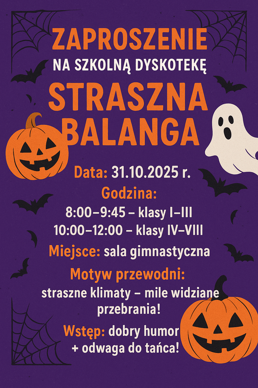 31 października – dyskoteka szkolna. Zmiana organizacji dnia i dowożenia dzieci.