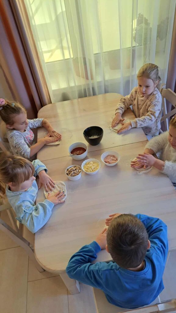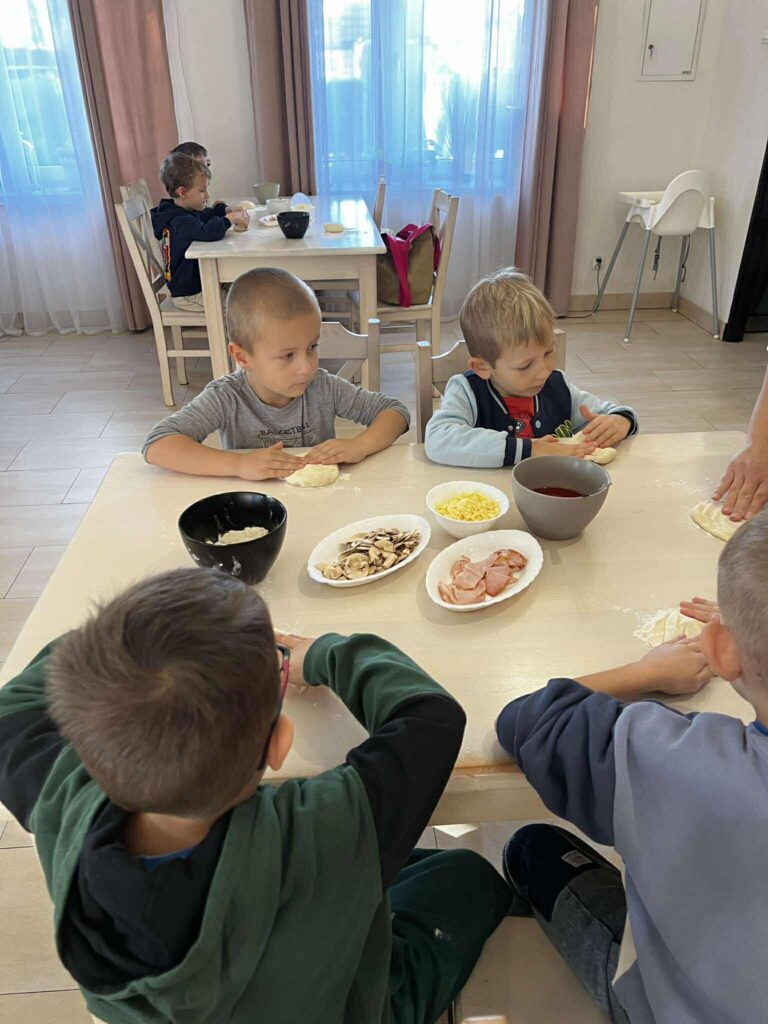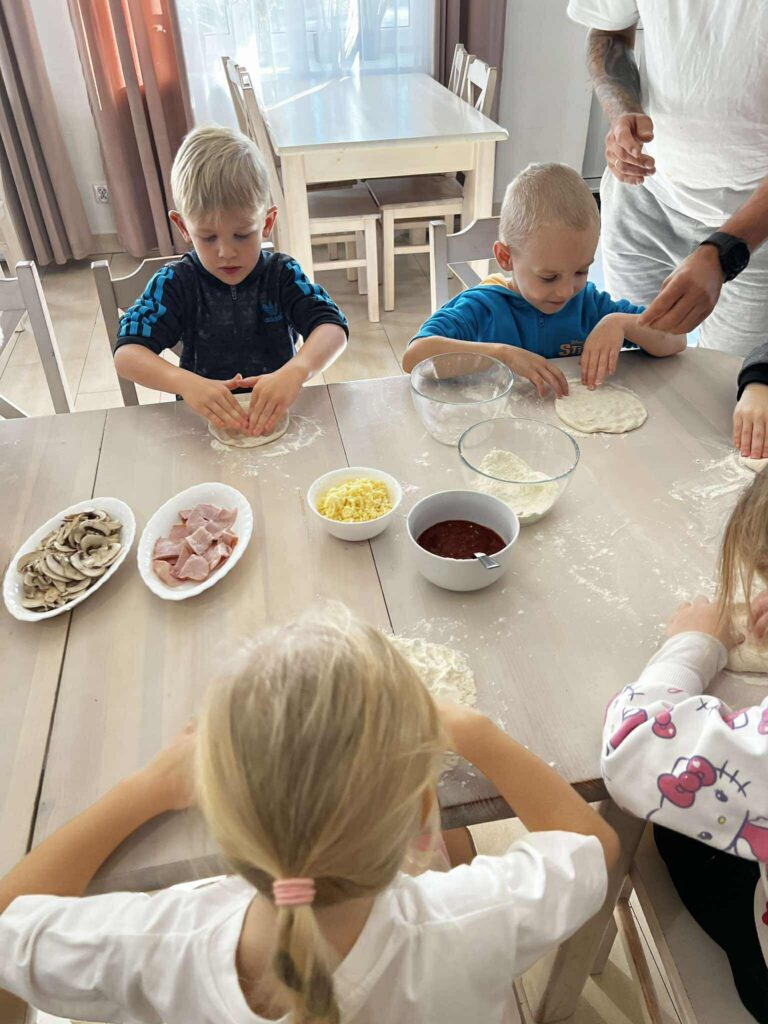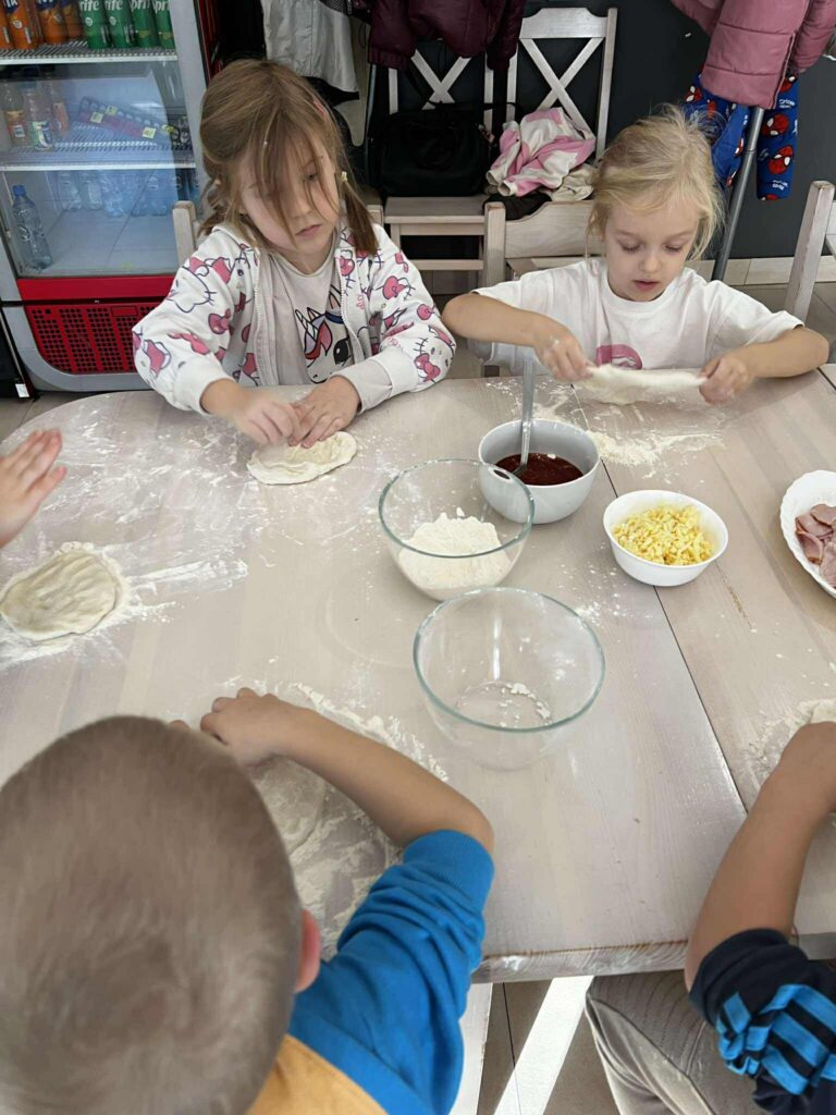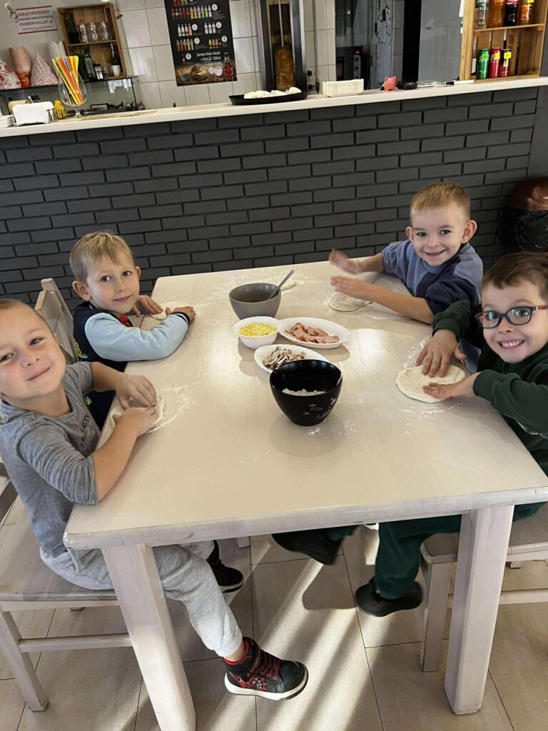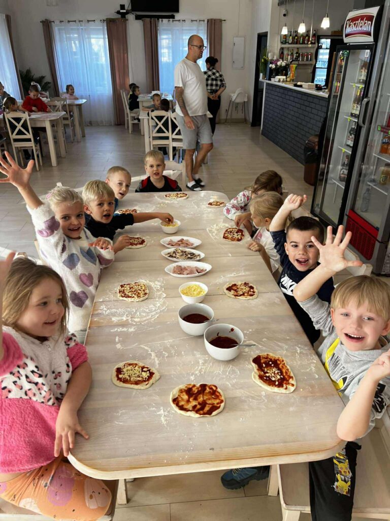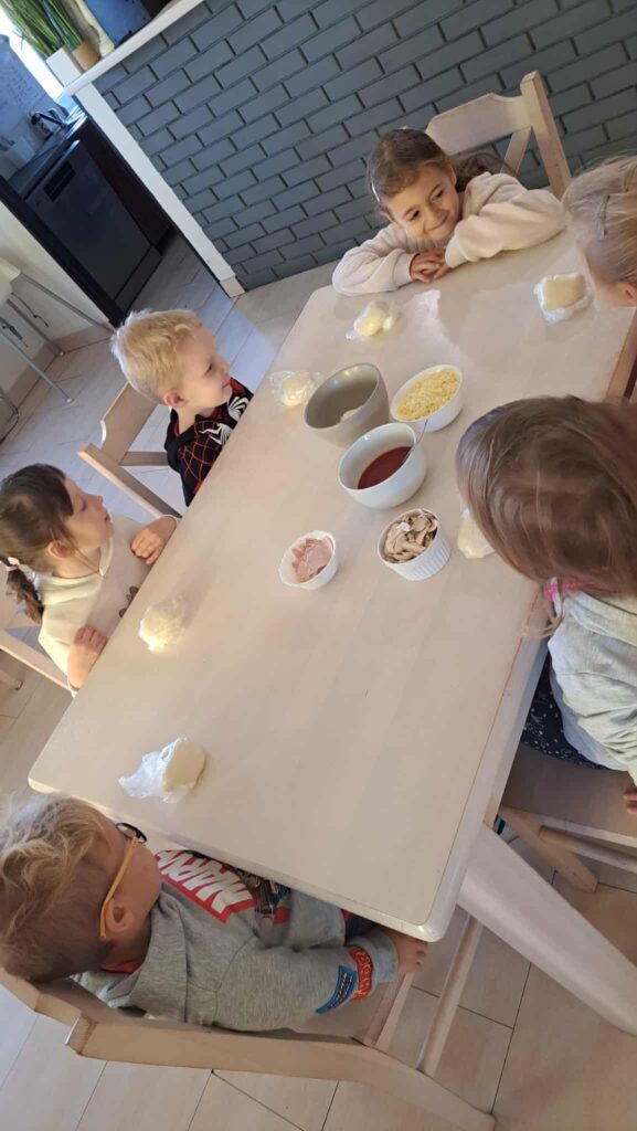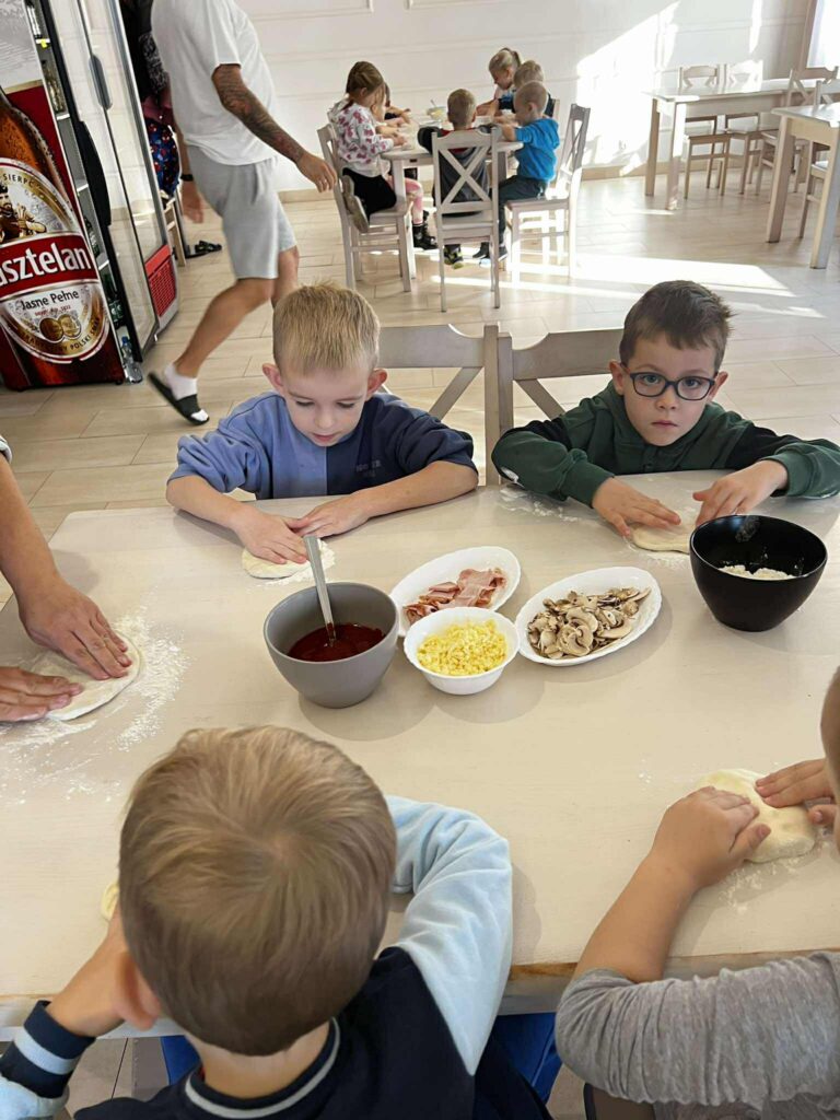 Dzieci poznały etapy powstawania pizzy – od przygotowania ciasta, przez dobór składników, aż po wypiek. Warsztaty były wspaniałą okazją do rozwijania współpracy, cierpliwości i samodzielności, a także kształtowania zdrowych nawyków żywieniowych.