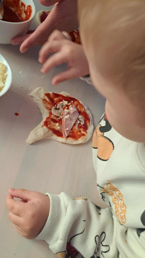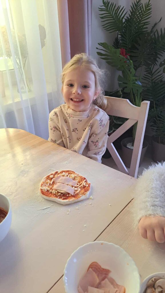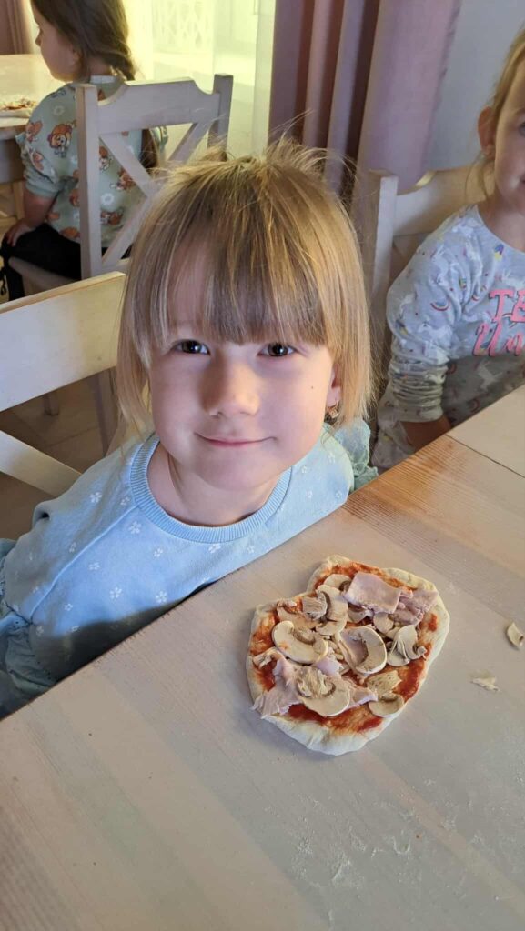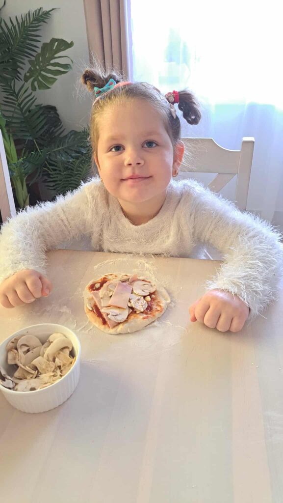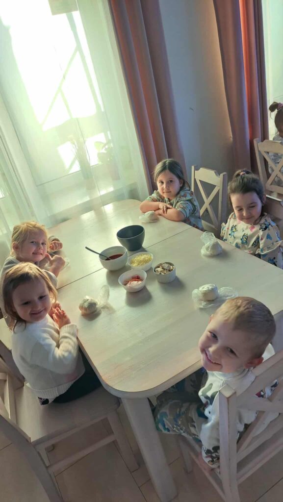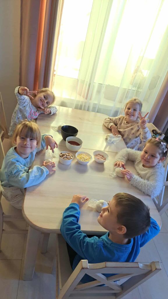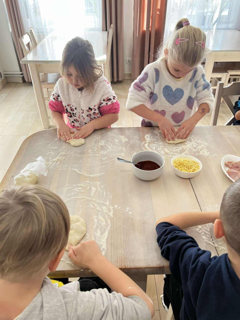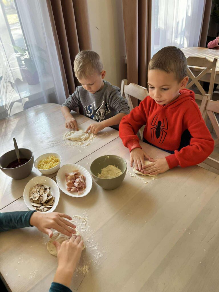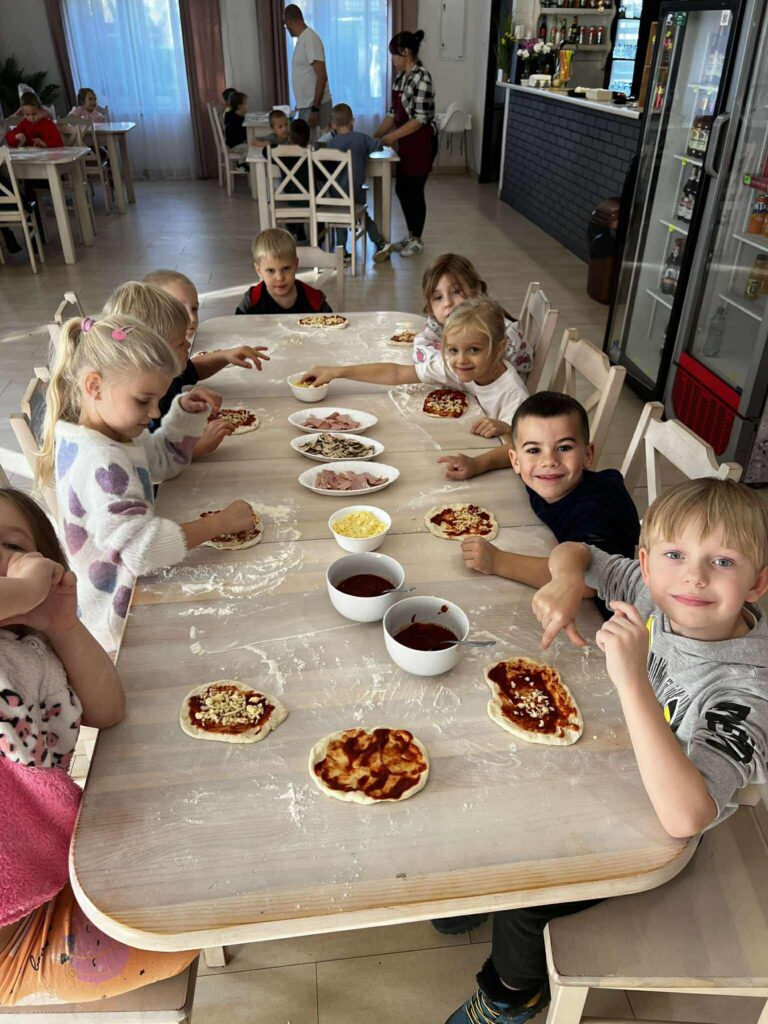 Dzieci poznały etapy powstawania pizzy – od przygotowania ciasta, przez dobór składników, aż po wypiek. Warsztaty były wspaniałą okazją do rozwijania współpracy, cierpliwości i samodzielności, a także kształtowania zdrowych nawyków żywieniowych.