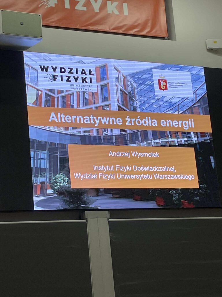 11 października uczniowie klasy 8, pod opieką pani Joli Sochackiej, nauczycielki fizyki, wzięli udział w zajęciach na Wydziale Fizyki Uniwersytetu Warszawskiego. Tematem spotkania były alternatywne źródła energii.