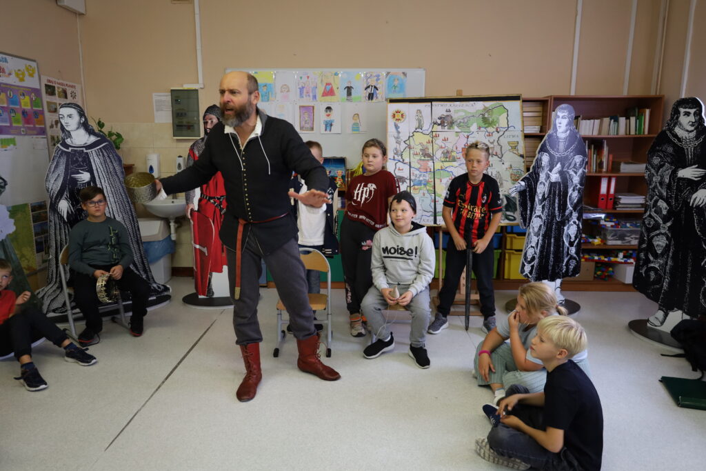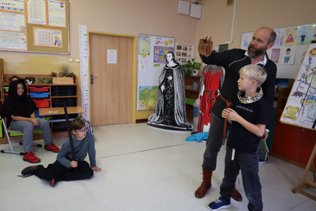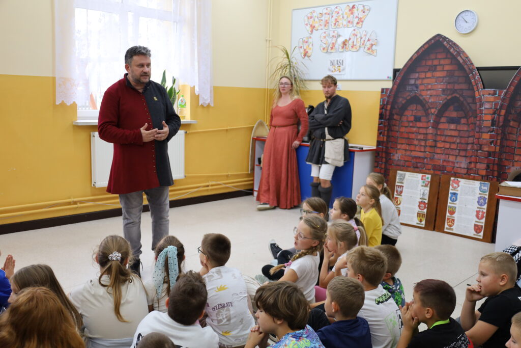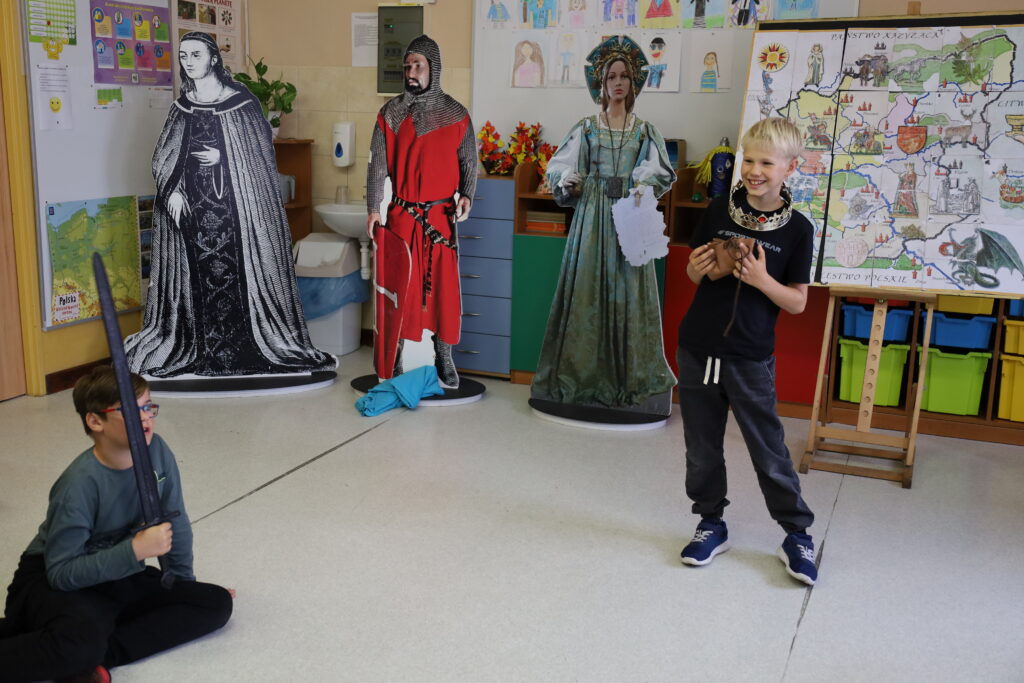 Nie zabrakło także teatrzyku historycznego, przygotowanego wspólnie przez uczniów. Wcielając się w dawne postacie, dzieci z entuzjazmem odtworzyły scenki z życia średniowiecznego grodu.