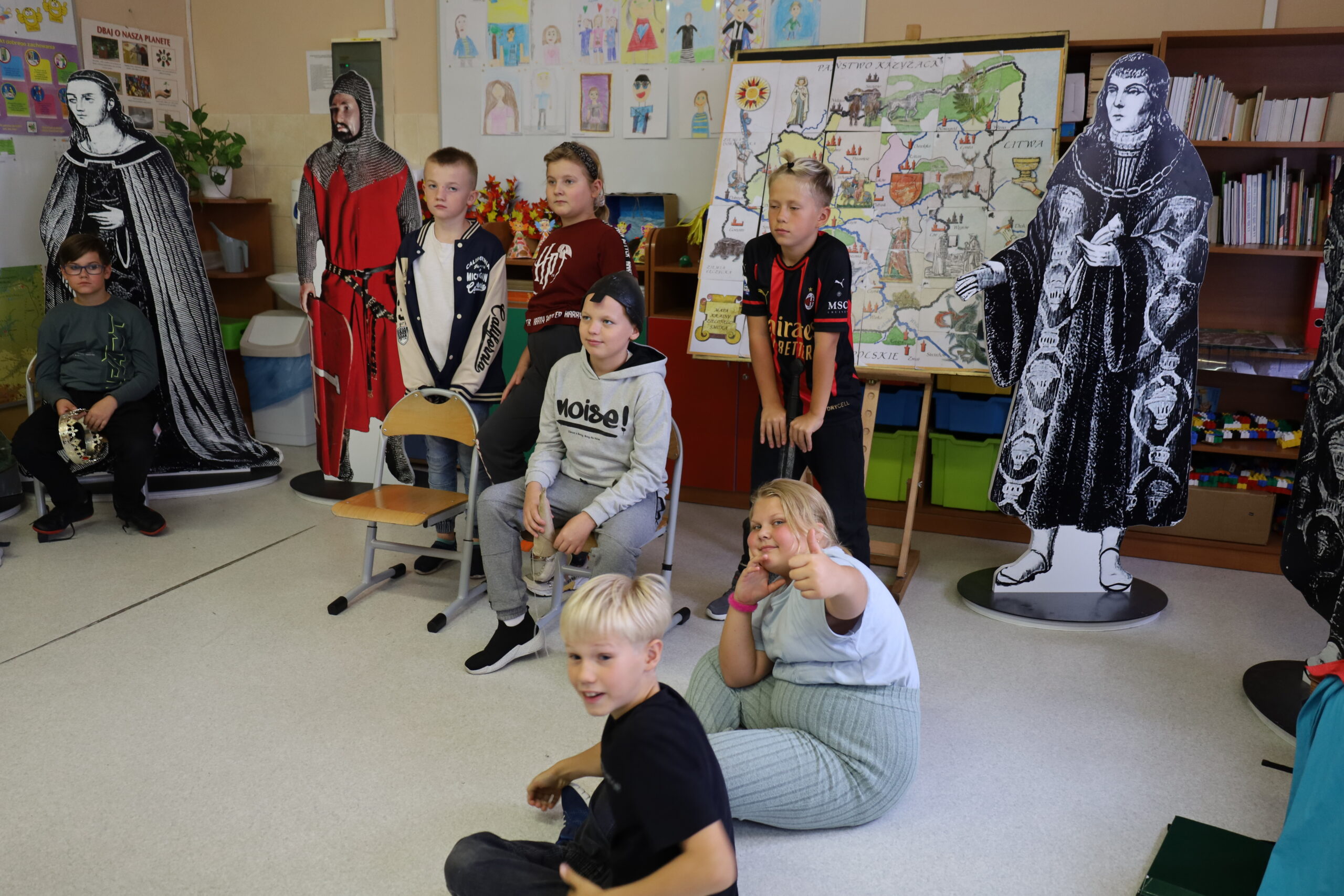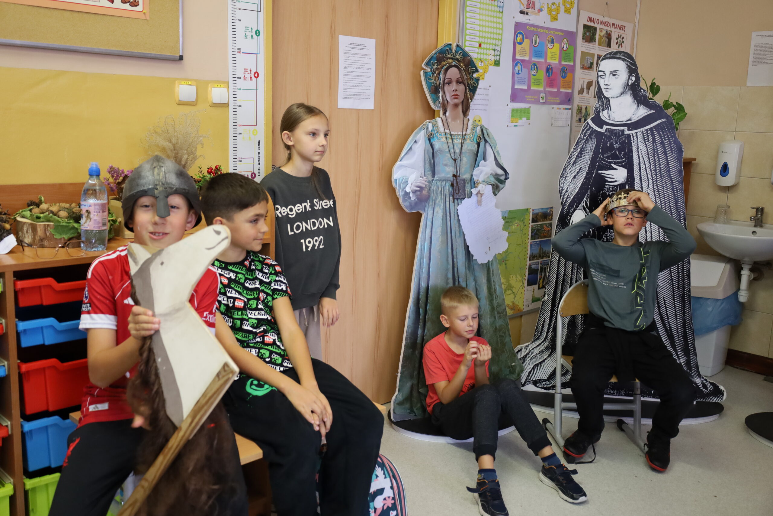 Nie zabrakło także teatrzyku historycznego, przygotowanego wspólnie przez uczniów. Wcielając się w dawne postacie, dzieci z entuzjazmem odtworzyły scenki z życia średniowiecznego grodu.