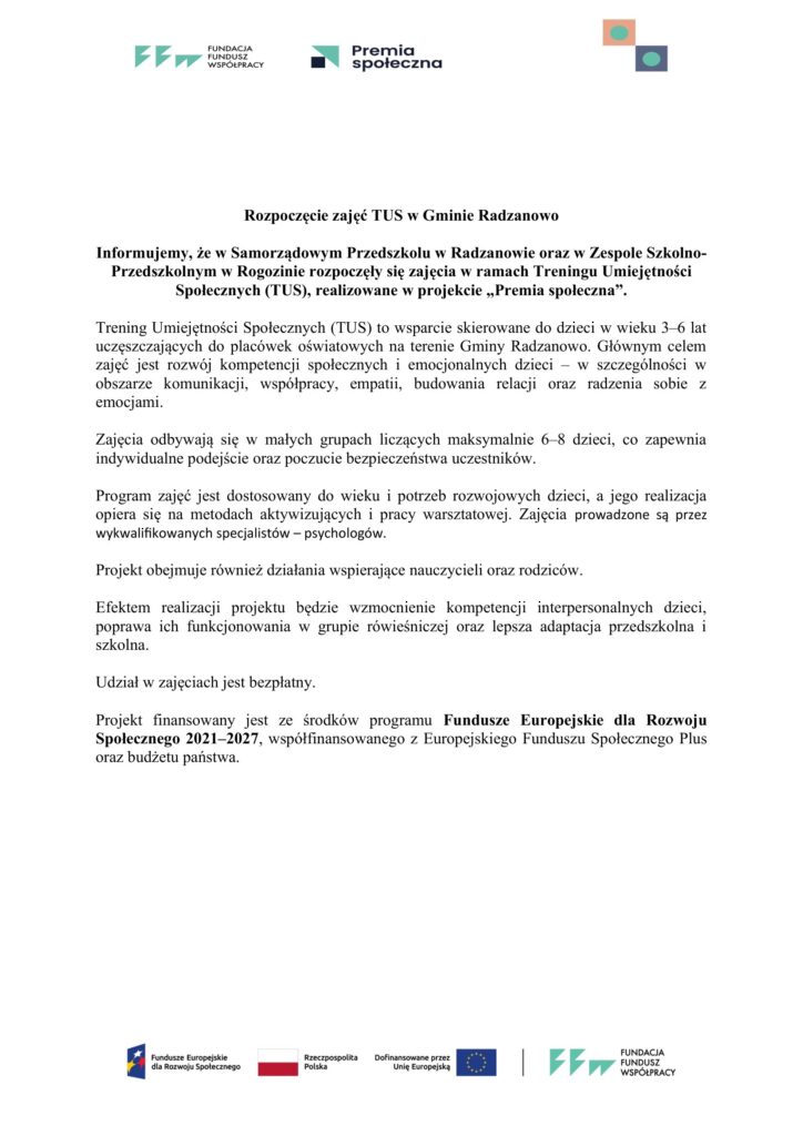 TUS to wsparcie dla dzieci w wieku 3–6 lat z terenu Gminy Radzanowo, którego celem jest rozwijanie kompetencji społecznych i emocjonalnych. Podczas zajęć dzieci uczą się m.in. skutecznej komunikacji, współpracy, budowania relacji, empatii oraz radzenia sobie z emocjami.