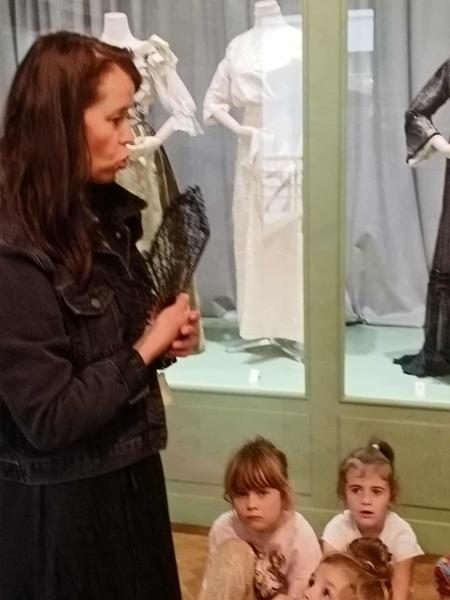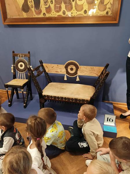 Jeżyki natomiast zwiedzały wystawę „Secesja”, poznając styl życia ludzi z przełomu XIX i XX wieku. Na zakończenie zajęć dzieci kolorowały suknię secesyjnej damy, wykorzystując pastele, co sprawiło im wiele radości.