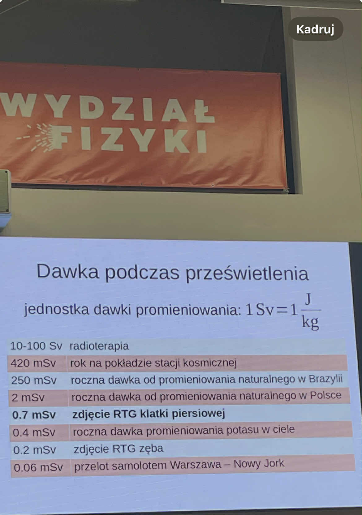 Na wykładzie zgłębiliśmy tajniki działania lampy rentgenowskiej, sposób powstawania obrazu oraz zjawiska fizyczne towarzyszące prześwietleniom. Nie zabrakło też rozmów o bezpieczeństwie i skutkach ubocznych promieniowania jonizującego.